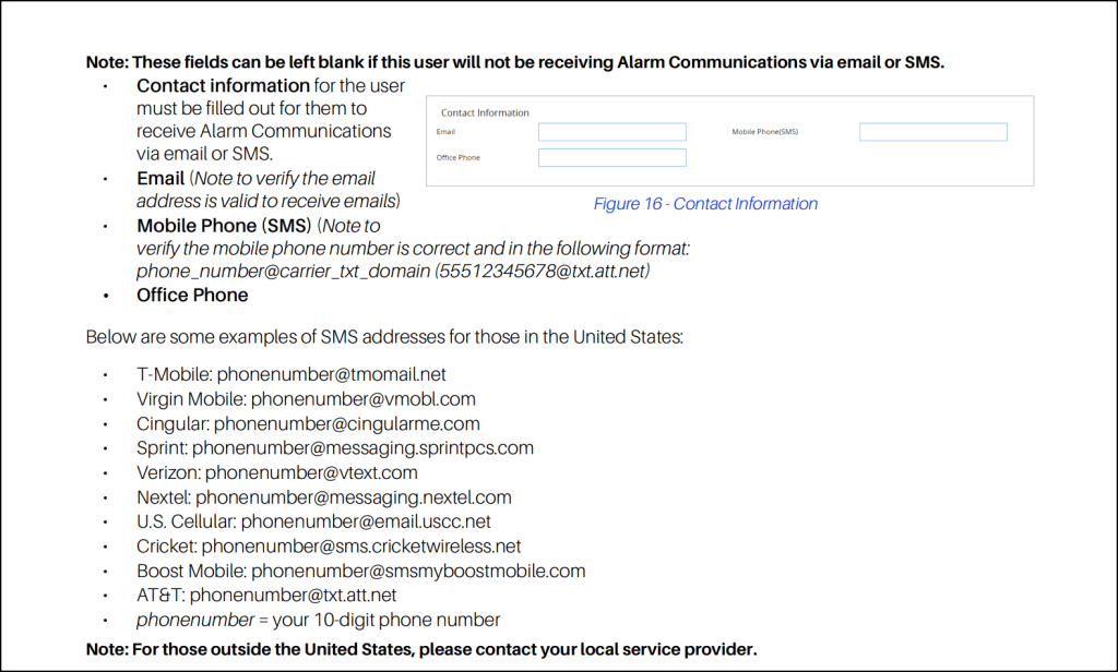 In the user’s contact info, put your yournumber@yourkeyword.text.email address in the Email field. Now when the controller sends an alarm email to this address, text.email converts it and delivers it as an SMS to your phone.