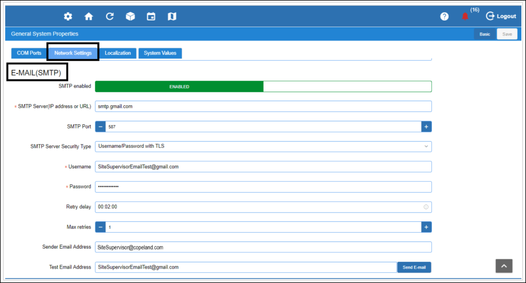 If your controller is already sending email alerts, this should already be filled in. You’ll see your SMTP server address and sender email.